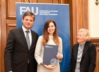Our student Natalia Malikova, enrolled in the master program Development Economics and International Studies received the Schüßler Award offered by the Hans-Wilhelm and Helga Schüßler Foundation. The prize recognizes that Ms. Malikova does not only show an outstanding performance in her degree program but in addition shows a high social commitment. For example, Ms. Malikova participates in the German-Russian cultural association “Brücken”, where she teaches Russian to children. The prize was handed out by Joachim Hornegger, the president of the University, together with the DAAD prize that was rewarded to Hülya Gizem Özka, student of chemistry.